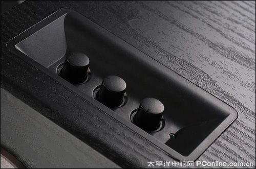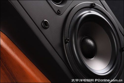 箱体的外观布局与原版类似,主箱体的音量旋钮右置。箱体外部采用玫瑰木纹贴皮,手感不错,保持着惠威一贯的做工素质。其实贴皮工艺不佳的箱体虽然对声音表现的影响不大,但是观感上却会令人不快,并且如果是在南方,箱体受潮变形也比较郁闷。目前大厂大品牌的中高端对箱在该点上做的都比较令人满意。