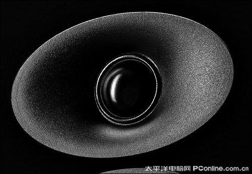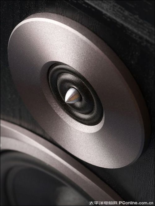 从外观上看,这枚高音单元与我们常见的球顶高音区别很大,很多人称之为子弹头高音,实际上这枚高音单元最关键的点并不在那个拉风的相位锥上,它并非真正的发音体。真正的振动部分还是在振膜上,材质是丝绢振膜。所不同的是常规球顶单元的驱动部分在振膜的最外围(音圈与振膜连接的部分在最外围);而这枚环状高音的中心与外围都被固定了,振动区被分为两个部分(这也是我们所看到的那两个黑色的丝膜环),音圈与振膜连接的部位在振膜的中部,而由于要与音圈连接,因此完成后振膜中部凹陷形成环状,这便是环状高音称谓的由来。