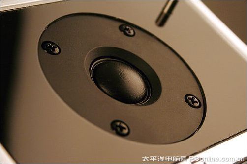 为了体现出产品的时尚感,前障板采用了高光材料,我们猜测其为了保证这个设计元素能够得到最大的体现,而没有采用传统的防尘罩设计,转而弄成低频单元固定的防尘罩。并且因此没有了传统防尘罩,高音单元也不得不增加防装杆了。