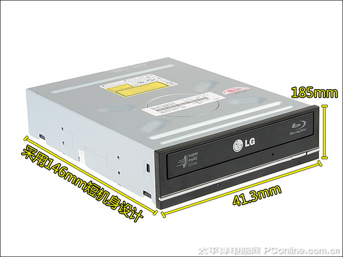从外观上看,这款LG BH08LS20蓝光刻录机采用了短机身设计,尺寸为146mm(W)x41.3mm(H)x185mm(D)(不含面板)。这样不仅安装时更加方便,也可以减少占用机箱内部的空间,对整体散热更有利。