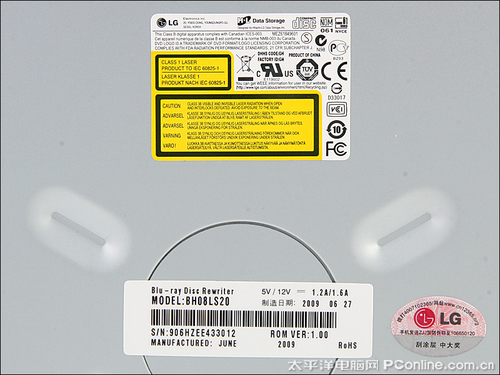 从铭牌上可以看到,这款LG BH08LS20蓝光刻录机是2009年6月27日生产的。