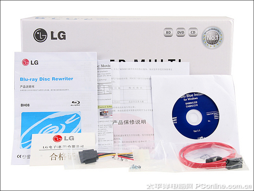 在附件上,LG BH08LS20蓝光刻录机除了提供有必备的安装螺丝、说明书和SATA连接线外,还提供有一根D型接口转SATA口连接线,Super Multi Blue软件安装光盘一张。