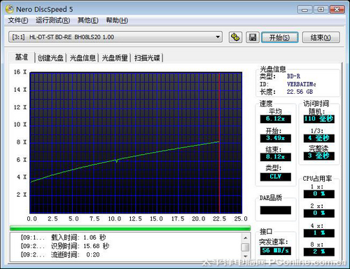 LG BH08LS20蓝光刻录机对BD-R盘的起始读取速度为3.49X,最高速度则达到了8.12X,和厂商的标称值基本一致,突发传输速度为56MB/S,读取方式为CLV(恒定线速度)。