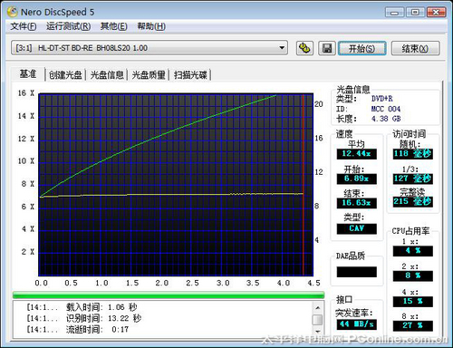 从上图可以看到,LG BH08LS20蓝光刻录机对DVD+R的起始读取速度为6.89X,最高读取速度为16.63X,突发传输速度为44MB/S,读取比较顺利,方式是CAV(恒定角速度)。
