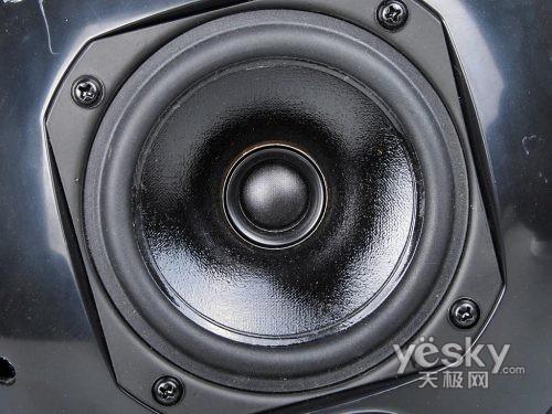 低音炮隐藏在音箱的底部,采用5.25"重量级双锶铁磁路系统重低音扬声器,低频素质不俗。另外,音箱的4个支腿垫起较高,尽可能减少箱体的共振。