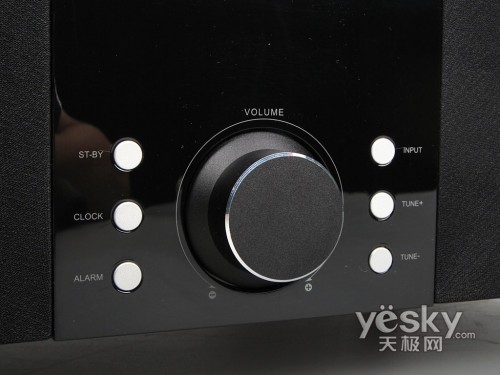 两个1.25英寸的中高频单元排列在前面板两侧。底座左侧为待机/播放/暂停键和音源选择键、还有红外接收器。右侧为曲目前进后退键及音量控制按钮,白色冷光液晶显示屏会显示各种工作状态及音量大小。