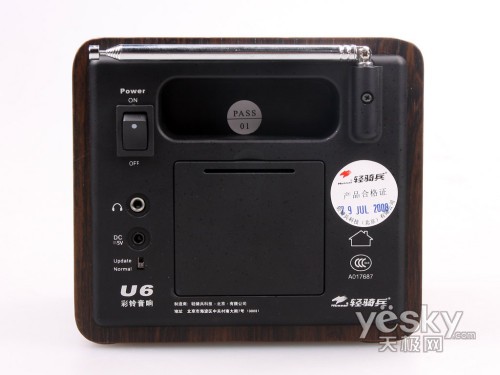 U6带有FM收音机功能,对于居家生活来说这个功能很有用处。产品背部一侧有一个伸缩的天线。