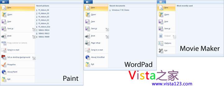 已经在使用Windows 7的用户应当会发现Windows 7中的画图、写字板以及新版Windows Live Essentials中的Moive Maker都是以一种全新的界面呈现在大家面前的。新的界面跟Office 2007的Ribbon界面有些类似,但其实是Ribbon UI的升级版,微软称之为,Scenic Ribbon UI。