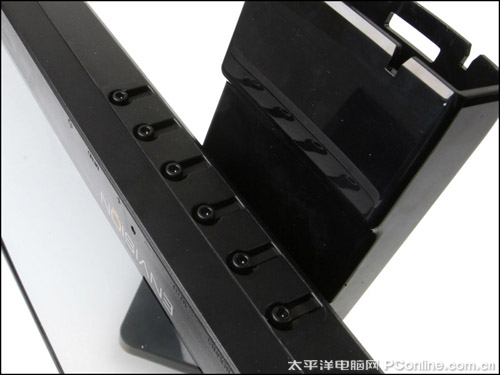 显示器底座是呈方形设计,其中边缘有弧边处理,支撑架是套进显示器底部,装卸都十分方便。调整角度时可以轻微调整显示器底座。