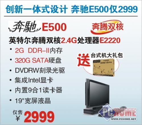 自上市以来,神舟奔驰E500一体式电脑就以其主机显示器合二为一的独特设计,以及超低价格和不俗的性能表现而深受广大消费者的喜爱。神舟奔驰E500从即日起处理器升级为奔腾双核2.4G E2220,这个暑假将再次掀起促销波澜,让你坐享高端处理器带来的澎湃新动力,关注的朋友千万不要错过,现在购买还送千元台式机大礼包!