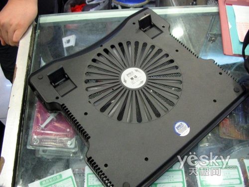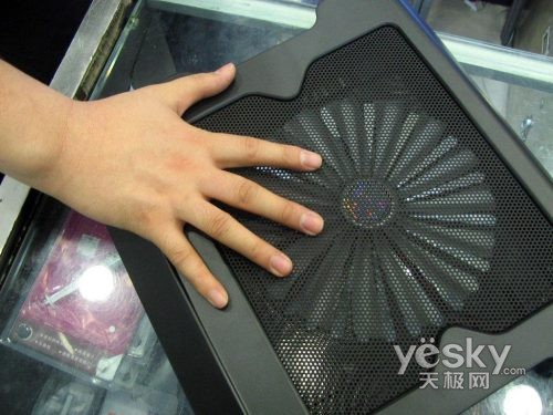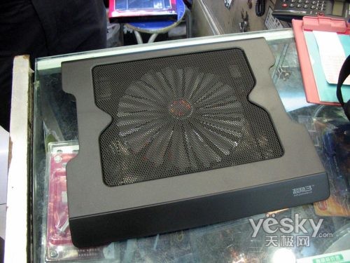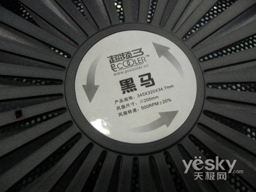 这款散热器的风扇尺寸竟然达到了惊人的20厘米,转速虽然不高,但最大风量可为60.95CFM(散热器尺寸345×320×36mm),使用寿命为30000小时,放在17寸笔记本上也绰绰有余了。