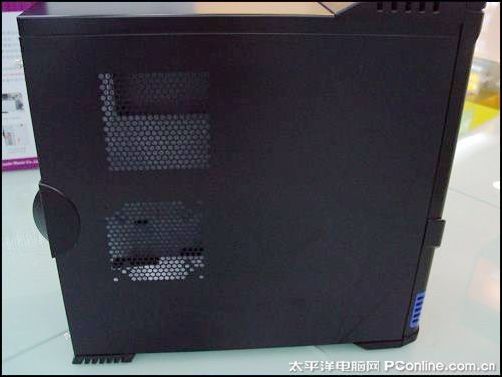 酷冷至尊 开拓者一代机箱采用了全黑的设计方案,辅以淡淡的蓝色,硕大的机身下,特别个性、彪悍,独特的造型带给人一种大气沉稳的感觉,加之前面板镶嵌的Cooler Master字样霸气十足。虽然酷冷至尊 开拓者RC-P100机箱霸气十足,但在设计上确相当的贴心,配备了网状散热孔,从散热孔往里面看能够看到内部采用了大面积六角冲孔网,加强机箱内部的风道提供更好的散热效能。