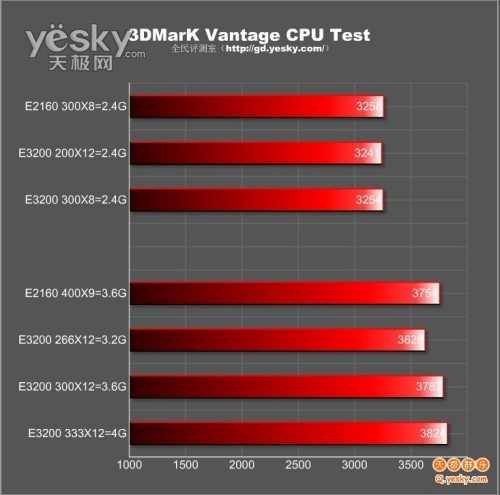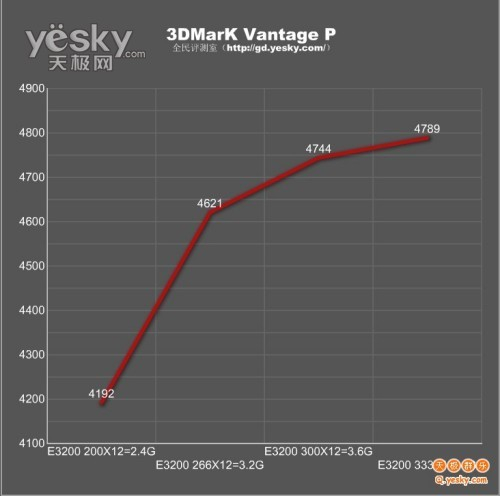 3DMark Vantage的游戏性能测试下,E3200超频到4G的频率所带来的性能提升幅度并不巨大,这一点下文会有具体的分析。