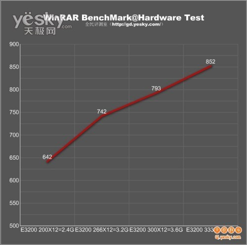 在WinRAR这种对内存性能要求很高的软件下,E3200超频后性能提高了大约35%,超频幅度为66%,性能的提高还基本与超频幅度一致,虽然并没有达成5成以上的性能提升幅度。这条超频后产生的性能梯度曲线相对平滑,这说明超频后有效地提高了内存处理的能力。