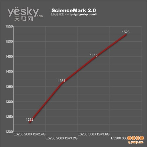 在Science Mark2.0下,同样是超频幅度达到66%,但是性能提升仅仅20%不到。但性能提升的曲线基本上还是一条随着主频提高而提高的直线。