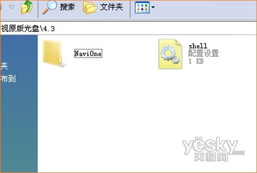 打开凯立德光盘基础版\4.3吋,可以看到两个文件:文件夹NAVIONE和一个名为shell的TXT文件。