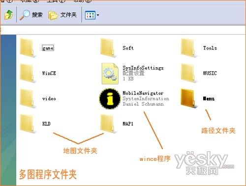 这个多图程序是一个多功能的gps引导程序,里面有工具、软件、游戏、音视频播放器、导航地图等多种功能,运行也比较稳定,各个文件夹的作用如图所示,用户只需要将相应的wince应用软件、游戏、音乐、视频放入相应的文件夹,即可以实现相应的功能。