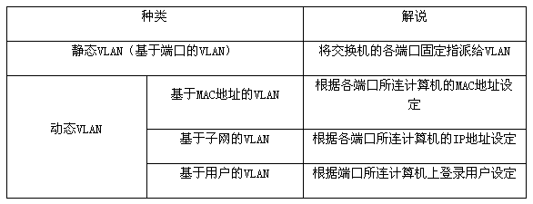 另一方面,动态VLAN则是根据每个端口所连的计算机,随时改变端口所属的VLAN。这就可以避免上述的更改设定之类的操作。动态VLAN可以大致分为3类: