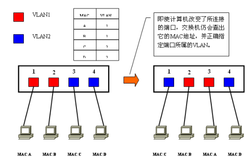 基于MAC地址的VLAN,就是通过查询并记录端口所连计算机上网卡的MAC地址来决定端口的所属。假定有一个MAC地址“A”被交换机设定为属于VLAN“10”,那么不论MAC地址为“A”的这台计算机连在交换机哪个端口,该端口都会被划分到VLAN10中去。计算机连在端口1时,端口1属于VLAN10;而计算机连在端口2时,则是端口2属于VLAN10。