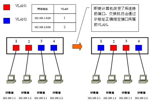 基于子网的VLAN,则是通过所连计算机的IP地址,来决定端口所属VLAN的。不像基于MAC地址的VLAN,即使计算机因为交换了网卡或是其他原因导致MAC地址改变,只要它的IP地址不变,就仍可以加入原先设定的VLAN。