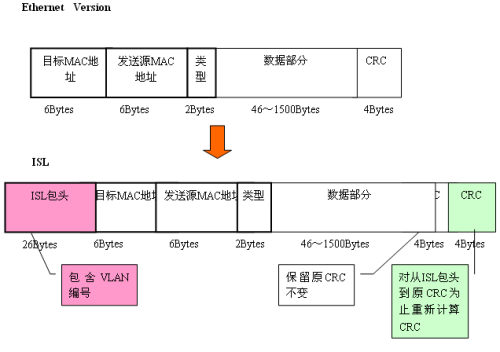 ISL有如用ISL包头和新CRC将原数据帧整个包裹起来,因此也被称为“封装型VLAN(Encapsulated VLAN)”。