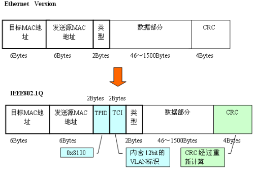 在数据帧中添加了4字节的内容,那么CRC值自然也会有所变化。这时数据帧上的CRC是插入TPID、TCI后,对包括它们在内的整个数据帧重新计算后所得的值。