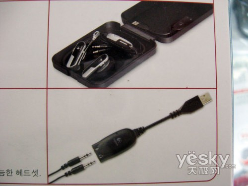 值得一提的是,这款耳机附带一个USB声卡,其上具有耳机输出和麦克风输入的功能,非常实用。