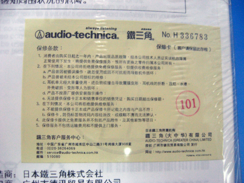 在ATH-SJ3包装盒上带有保修卡,购买本产品可以在一年之内享受保修服务,用户可以放心购买。