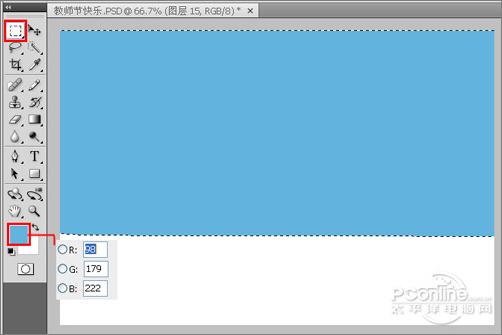 2、在图层面板中新建一个图层,接着工具箱选择矩形工具,在工作区中拖出一个矩形的形状,设置前景色的颜色为蓝色,RGB值分别是98、179、222,填充给矩形的形状,接着按键盘快捷键Alt+Delete填充,按键盘快捷键Ctrl+D取消选区,如图2所示。