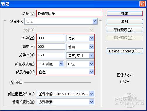 1、选择“文件/新建”菜单,打开“新建”或者Ctrl+N对话框 名称为:教师节快乐,预设为:自定,宽度:800像素, 高度:600像素, “分辨率”为72 , “模式”为RGB颜色的文档,然后点击确定按钮,如图1所示。