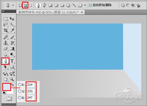 4、在图层面板上单击创建新图层按钮 ,再用钢笔工具,画出一个无规则的形状,在工具箱中选择设置前景色,设置前景色的颜色为淡蓝色,RGB值分别是214、231、247,填充给无规则的形 状,按键盘快捷键Ctrl+Enter转换为选区,接着按键盘快捷键Alt+Delete填充,按键盘快捷键Ctrl+D取消选区,如图4所示。