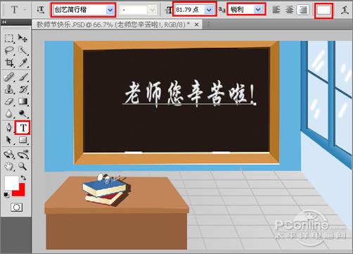 18、在工具箱中选择横排文字工具 ,在画面中用鼠标单击后,出现一个输入文字光标,在光标后输入“老师你您辛苦啦”,在工具选项栏中设置字体为“创艺简行楷”,设置字体大小为“81.79 点”,设置消除锯齿为“锐利”,设置字体颜色为白色,并按快捷键Ctrl+T自由变化工具调整,如图18所示。