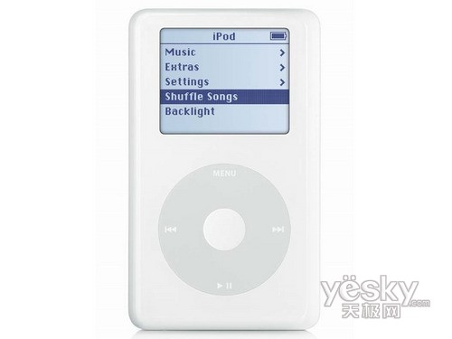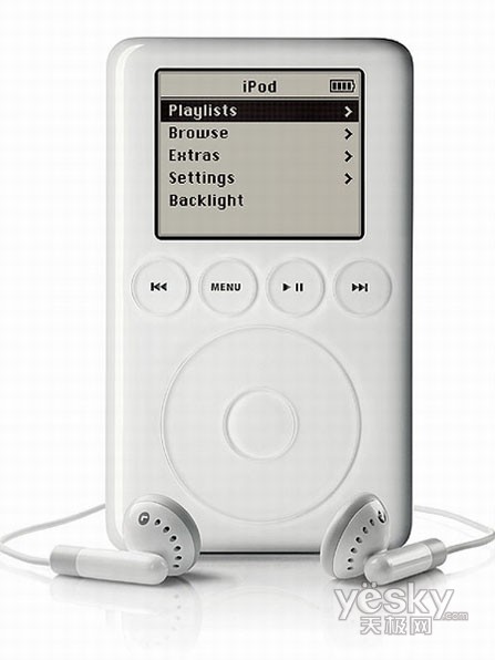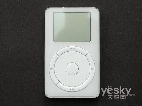 2001年10月,第一代iPod播放器推出。当第一代iPod诞生的时候,它只有5GB的容量,屏幕的分辨率只有160×128像素,只有32MB的RAM和32MB的ROM。它甚至不能与Windows操作系统兼容,颇有历史意义的是,它采用了1.8英寸的为硬盘作为存储介质,并采用了机械卷轴滑轮式操作按钮。当时,这款iPod播放器的售价为399美元,在开售的头两个月,一共售出了125000台。