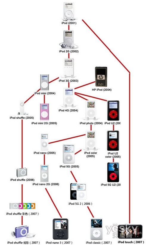 2001年苹果推出了第一代iPod产品,时至今日苹果iPod家族已经有iPod、iPod photo、iPod classic、iPod video、iPod nano、iPod shuffle、mini iPod以及iPod touch等数类型号,几十款产品,如今iPod的销量早已超过1亿部。如今iPod占世界MP3销量的70%,最新的产品型号为iPod classic、iPod shuffle、iPod nano和iPod touch。