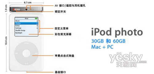 2004年10月,iPod photo和U2 iPod诞生。同样这两款产品并不属于第五代。都是在第四代的基础上进行的修改,iPod photo首次采用了60GB的微硬盘作为存储介质。iPod photo可以支持相片浏览,iPod photo的外形大小为4.1×2.4×0.75英寸。40GB版本的售价为499美元,60GB版本的售价为599美元。之后,为了让价格的差异更加明显,苹果推出了30GB的iPod photo,售价350美元。