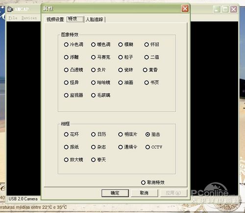 安装了AMCAP增值软件之后,蓝色妖姬C600蓝光Ⅰ号提供了18种特效,10种相框,还有人脸追踪功能,对于拍照爱好者来说这会是一个令人激动的功能。