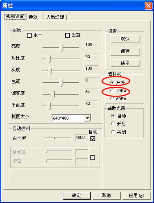 打开amcap或是摄像头测速软件(这两个小软件均可在蓝色妖姬官方网站下载中心下载),点击Options—Video Capture Filter,出现图二,在“去抖动”选项里面选在“户外”实现户外模式的转换,选择“50Hz”或“60Hz”为室内模式。