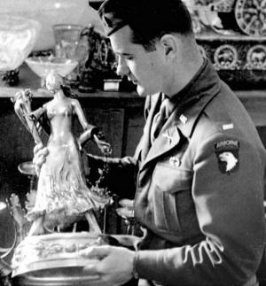 | 一名盟军士兵在戈林家中检查一些被他掠夺来的艺术珍宝。 |