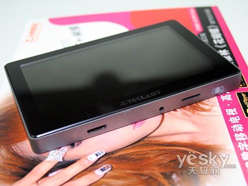 在外观上,机身采用了银灰色锌镁合金压铸全金属设计,拿在手里质感十足,正面除了屏幕之外,没有任何多余元素,有效减少了整机体积,实际感觉刚好合适。外屏为加硬纳米镜面材质,硬度很大,可以有效的保护屏幕。配备了5英寸800*480高清液晶屏,锌镁合金精密压铸机身设计,结构紧凑。台电C500HD接口丰富,全部安装在上下右三个边上,上部为四个操作控制按钮,右边是独立的电源开关及音量调节按钮,以及耳机、高清视频输出及USB数据传输端口。