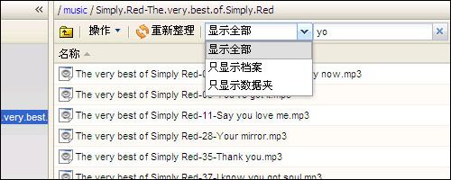 如何在大量的文件中找到自己所需要的?在WINDOWS中我们可以使用Ctrl + F,在DS109中只要在搜索框中输入关键字即可,当前窗口中符合条件的文件会自动显示出来,搜索动作是自动的,当搜索框中为空时,将显示当前目录中的所有内容。另外,对于搜索结果还可以选择只显示文件、目录或两者都显示。