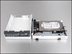 安装硬盘非常简单,将硬盘推入适当位置后再拧紧螺丝即可。硬盘下面是主板,DS109的核心芯片和网络控制芯片均采用的marvell产品,1.2GHz CPU,128M内存,1000Mbps网卡,这一配置对于入门级NAS产品来讲已足够。
