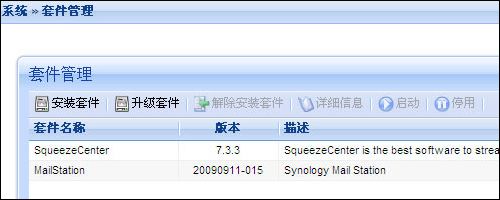 DS109支持的套件非常丰富,笔者安装了MailStation和SqueezeCenter组件,前者使DS109具有了邮件服务功能,后者则是为Logitech(罗技)的Squeezebox产品量身订制的功能,什么是Squeezebox?请点击这里。除了Synology自主开发的软件,还有众多第三方套件可用,像Wordpress、phpBB、Joomla!等等共十余款,可充分满足DIY用户的需求。具体可以访问这里。