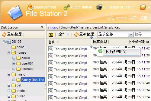 用户使用自己的账号登录DS109后,系统会根据当前用户的权限分配不同的共享资源,上图中我们使用ADMIN帐户登录,所有的共享文件夹全部显示了出来。另外,在文件显示窗口,每一列的抬头是支持拖曳的,例如笔者把“上次修改时间”托到了“名称”后面。