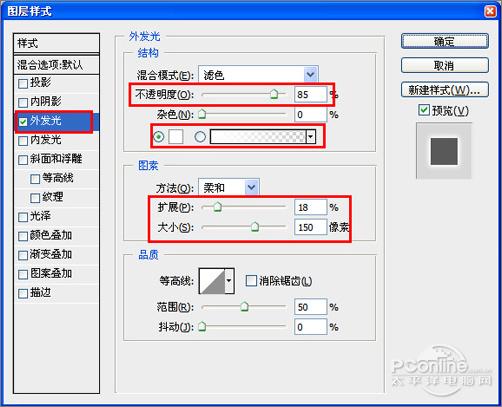 12、双击文字图,弹出“图层样式”对话框,勾选“外发光”选项,不透明度设置为:85%,发光颜色设置为:白色,扩展设置为:18%,大小设置为:150像素,如图20所示;完成图层样式的效果,如图21所示。