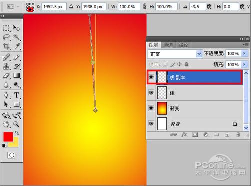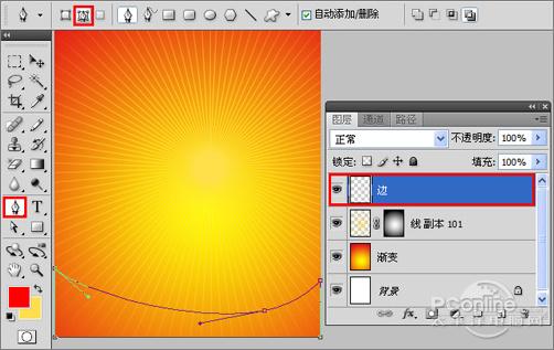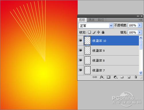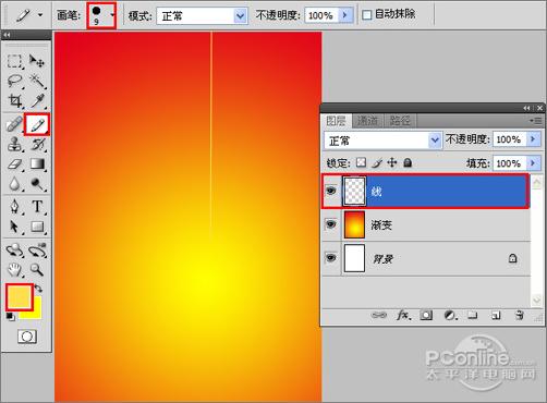 3、按组合键Ctrl+Shift+N 新建图层并命名为:线,选择工具箱中的铅笔工具,在工具选项栏上设置画笔大小为:尖角 9 像素,前景为设置为:#ffdf4c,按住Shift键绘制出直线,如图3所示。