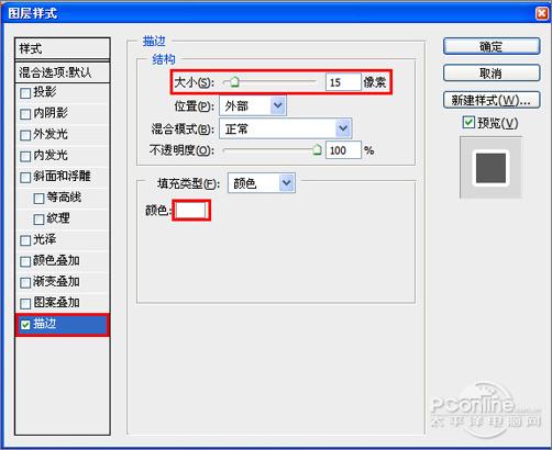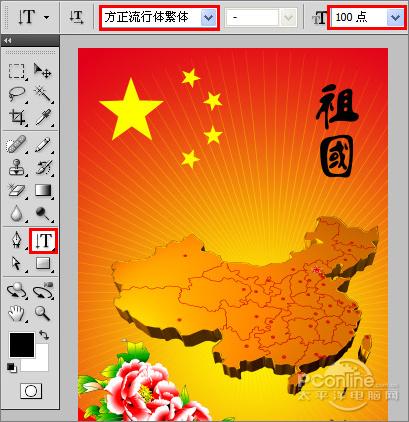10、选择工具箱中的直排文字工具,在页面上方输入:祖国,字体设置为:方正流行体繁体,字体大小设置为:100点,如图15所示;双击文字层,弹出 “图层样式”对话框,勾选“描边”选项,大小设置为:15像素,颜色设置为:白色,如图16所示;使用同样的方法,设置“万岁”效果,如图17所示。