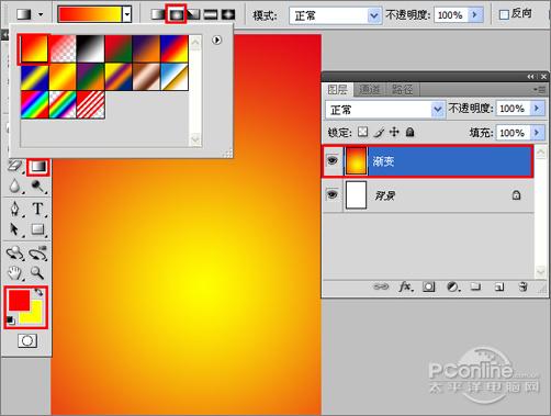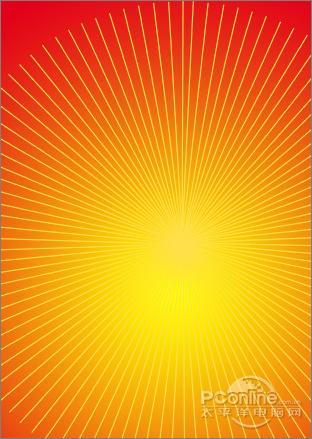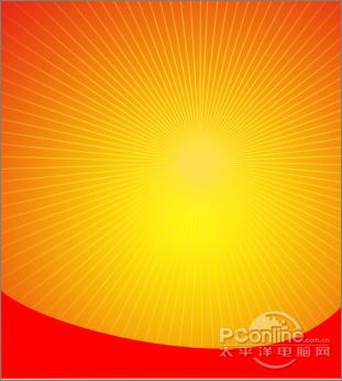 2、选择工具箱中的渐变工具,前景色设置为:红色,背景色设置为:黄色,在工具选项栏上选择“前景色到背景色渐变”样式,再选择径向渐变,按组合键Ctrl+Shift+N 新建图层并命名为:渐变,在页面中从上到下拖曳出渐变,如图2所示。