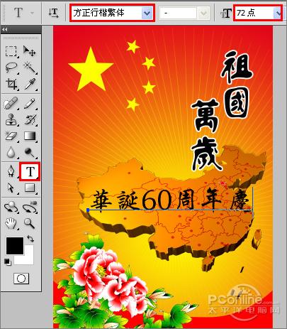 11、选择工具箱中的横排文字工具,输入:华诞60周年庆,字体设置为:方正行楷繁体,字体大小设置为:72点,如图18所示;使用横排文字工具,选中“60”,字体设置为:经典综世体简,字体大小设置为:100点,颜色设置为:红色,如图19所示。