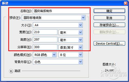 1、打开Photshop CS4软件,执行菜单:“文件”/“新建”(快捷键Ctrl+N),新建文件,设置名称:国庆海报制作;预设选择为:国际标准纸张,大小为:A4,宽度:210像素;高度:297像素;分辨率:300像素/英寸,如图1所示。