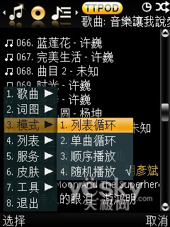 天天动听V3.51支持MP3、OGG、WMA、AAC、MP4、M4A、MID、AMR等格式音频文件播放,可以建立播放列表,在播放模式方面可以选择列表循环、单曲循环、顺序播放、随机播放四种模式。